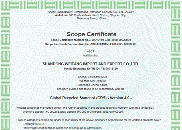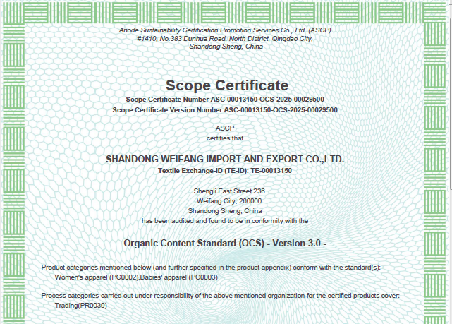 公司自營和代理服裝、食品、五金、化工、機電等各類商品及技術(shù)的進出口業(yè)務,公司有專門的生產(chǎn)、加工基地,并通過了Oeko - Tex Standard 100、GRS、OCS、RCS、USCTP等多項認證,可以按客戶要求設計生產(chǎn),同時承辦中外合資經(jīng)營、合作生產(chǎn)、開展“三來一補”以及技術(shù)輸出、易貨、邊境貿(mào)易等業(yè)務。公司產(chǎn)品出口到日本、法國、俄羅斯等50多個國家或地區(qū)。